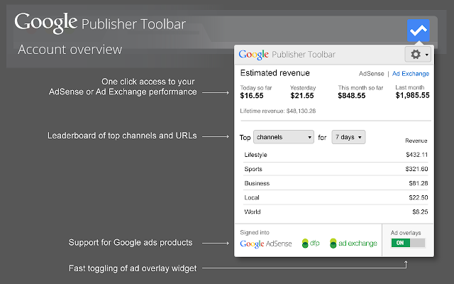 Whether youre using AdSense, Ad Exchange or DoubleClick for Publishers, with the Google Publisher Toolbar you can view information on each of your Google ads, block unsuitable creatives, and see an account overview, all while browsing your own site.